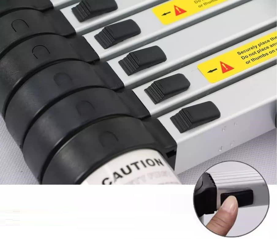 Folding telescopic ladder with sturdy aluminum construction and easy storage.