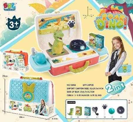 Dinosaur care set in a great design with many accessories, in a practical carrying case that easily converts into a table play bench.