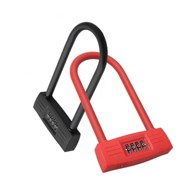 Steel motorcycle lock with 4-digit security code and protective cover to prevent scratching the rim.