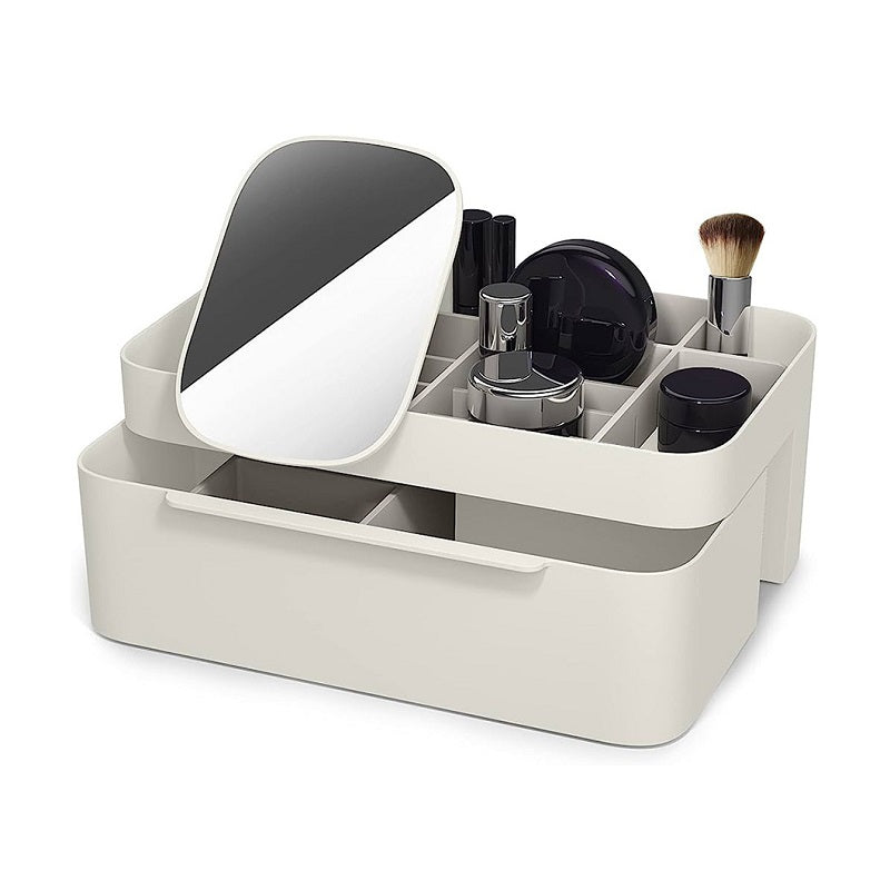 Cosmetic and trinket organizer desk stand with built-in mirror, drawer and multiple organizer compartments, with space-saving ergonomic design.