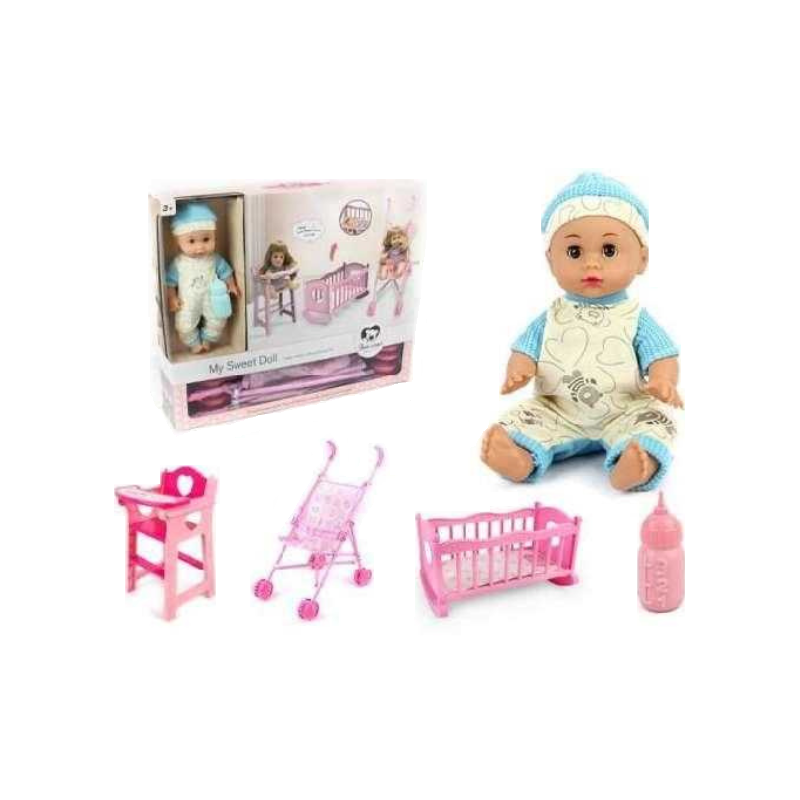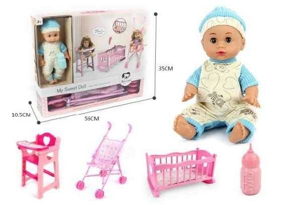 Baby doll with full set of bed, high chair, and stroller to take care of your doll like a real baby!