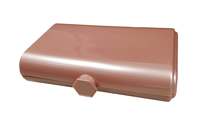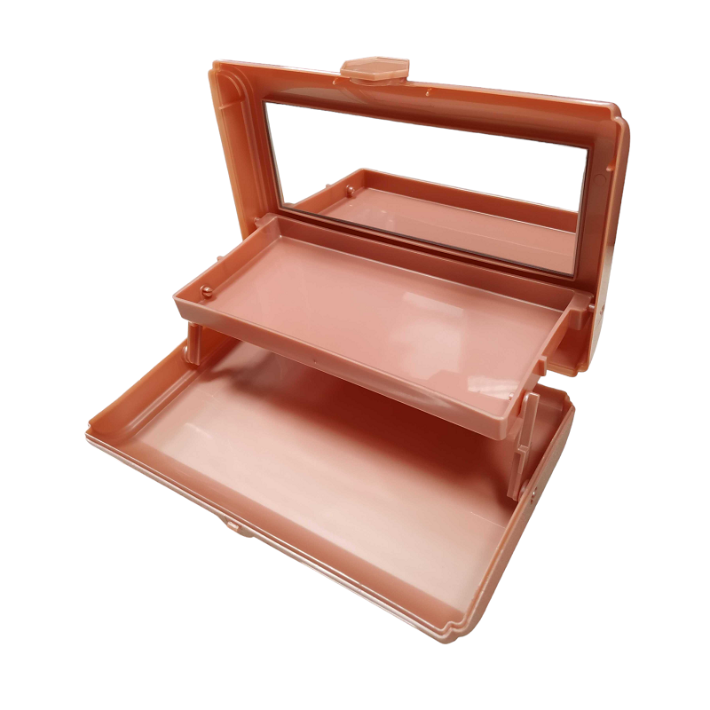 Plastic cosmetic and trinket organizer box with mirror and ergonomic 2-tier space-saving design.