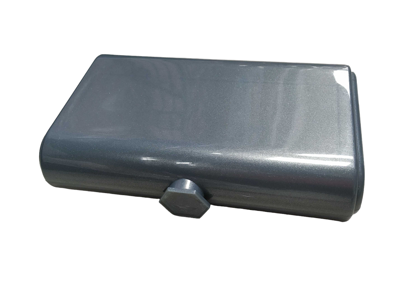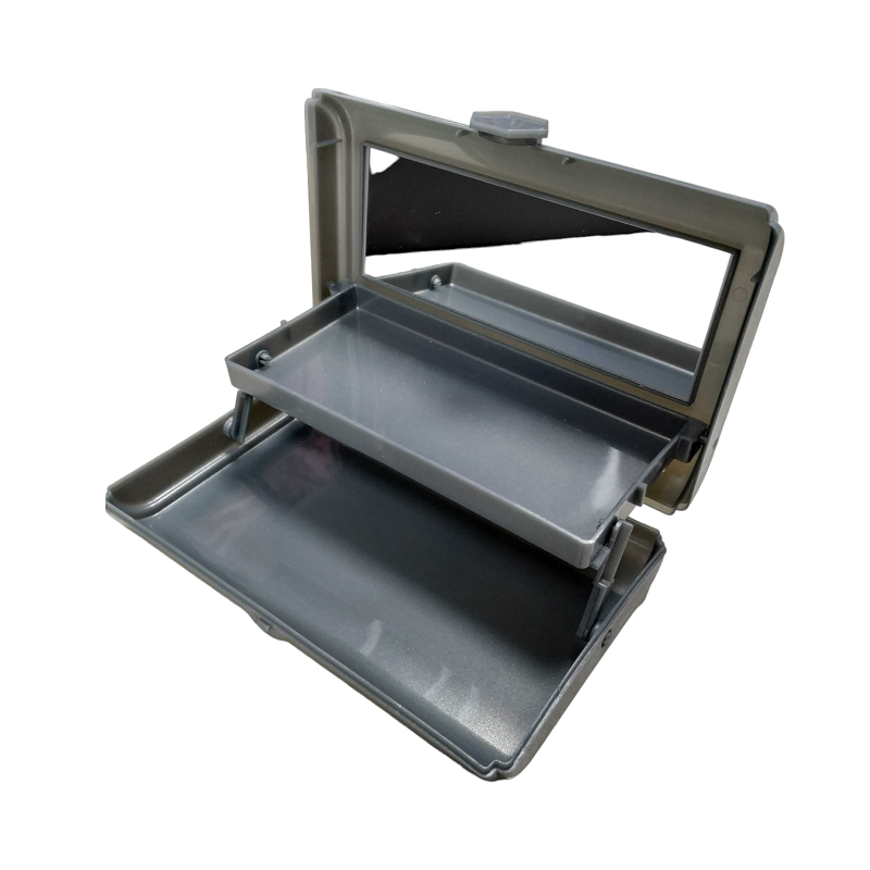 Plastic cosmetic and trinket organizer box with mirror and ergonomic 2-tier space-saving design.