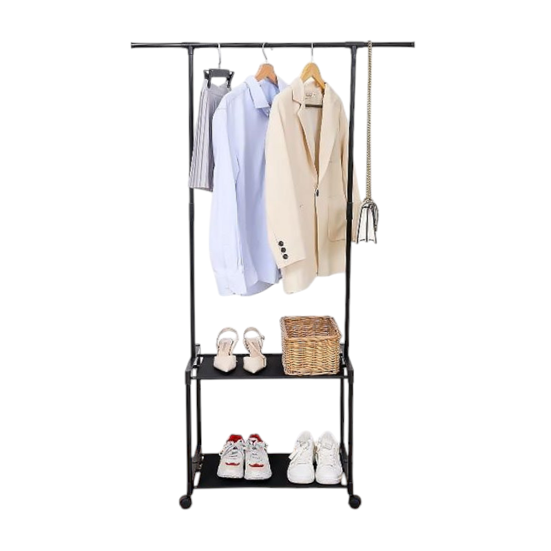 Τροχήλατη κρεμάστρα δαπέδου μονή με 2 ράφια υφασμάτινα πολλαπλών χρήσεων, ιδανική ως έπιπλο εισόδου ή για την οργάνωση των ρούχων στο δωμάτιό σας. Μεταλλικός σκελετός. Ρυθμιζόμενο ύψος. Διαστάσεις: (147-160) x 98 x 35cm