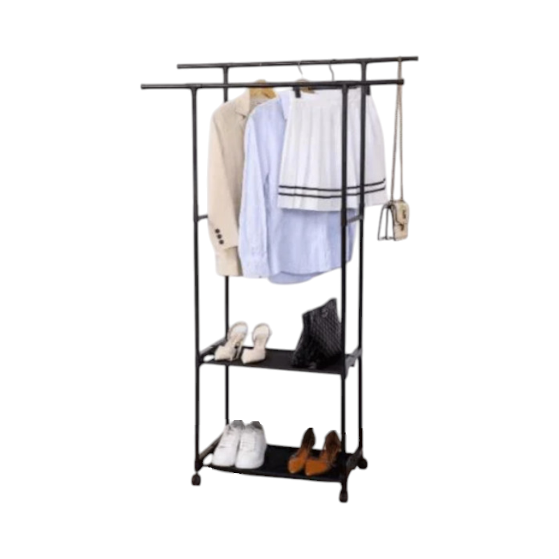Τροχήλατη κρεμάστρα δαπέδου διπλή με 2 ράφια υφασμάτινα πολλαπλών χρήσεων, ιδανική ως έπιπλο εισόδου ή για την οργάνωση των ρούχων στο δωμάτιό σας. Μεταλλικός σκελετός. Διαστάσεις: 160 x 98 x 35cm