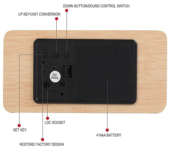 LED digital alarm clock, in a unique design with a wood effect. Practical size that can be placed anywhere and add a modern touch to your space.