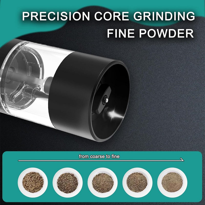 Electric salt/pepper mill in an elegant design with adjustable steel blade for different cutting thicknesses.