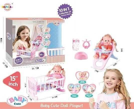 Baby doll with full set of bed, high chair, and accessories to take care of your doll like a real baby!