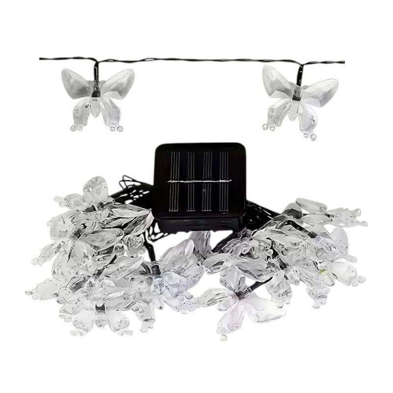 Ηλιακή γιρλάντα φωτισμού LED με λαμπτήρες σε εντυπωσιακό σχέδιο Πεταλούδα, με ενισχυμένο καλώδιο και ρυθμιζόμενο ηλιακό πάνελ, ιδανική για έναν όμορφο ατμοσφαιρικό φωτισμό στο μπαλκόνι, τον κήπο ή τη βεράντα σας, εύκολα, ασύρματα και οικονομικά χωρίς την ανάγκη πρόσβασης σε ρεύμα.