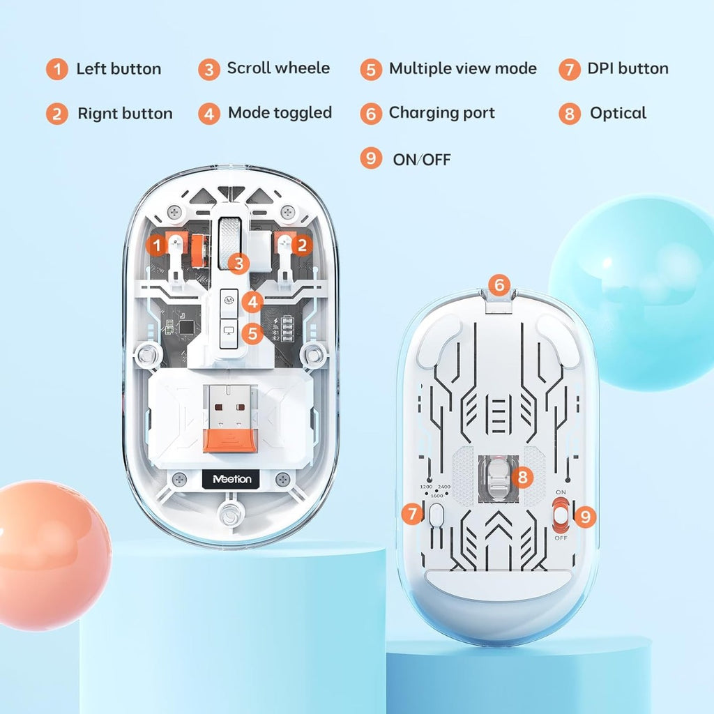 【Sleek and Comfortable Hand Feel】 The ultra-thin transparent magnetic design of the mouse shell ensures a secure attachment. Also, the unique circular wheel design and larger contact surface provide additional comfort during use. The silent design for the left and right buttons creates a quiet environment at home or in the office. This ambidextrous Bluetooth mouse is designed for comfort and extended use. It fits perfectly in the palm of your hand, perfectly fitting both hands. 【Dual-mode wireless mouse】 The computer mouse features seamless switching between Bluetooth 5.1 and 2.4G wireless connections for stable and reliable performance. Connect up to 3 devices and control them effortlessly with one mouse. While 2.4G provides plug & play convenience, no driver is needed. (The USB receiver is stored under the magnetic top cover). 【Wireless Rechargeable Mouse】This mouse has a built-in 400mAh battery capacity with Type-C fast charging cable (included), say goodbye to replacing batteries. It only takes 2 hours to charge for 15-30 days. The mouse has low power consumption and automatically goes into sleep mode after 15 minutes of no operation to save power, you can wake it up by clicking any button.
