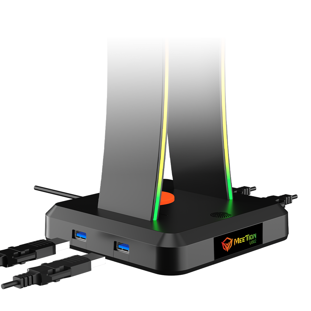 U002 is a bungee jumping gaming headset desk stand, the stand has RGB backlight design, the light can be adjusted manually, there are 11 RGB lighting modes, perfectly matching your gaming keyboard and mouse, highlighting the atmosphere, letting you be in the colorful world, providing an immersive user experience. The stand has 4 USB ports to power other devices, one-touch button to turn on or off the backlight, the stand is equipped with a bungee cord, USB power supply, plug and play, no driver required. As part of a smart desktop management system, it gives you the opportunity to keep all your USB devices and cables tidy and easily accessible - just plug them into the four fully powered ports of the stand. The bungee mouse cable holder prevents tangled and tangled cables and gives the mouse a wireless feel - ensuring smooth gameplay.