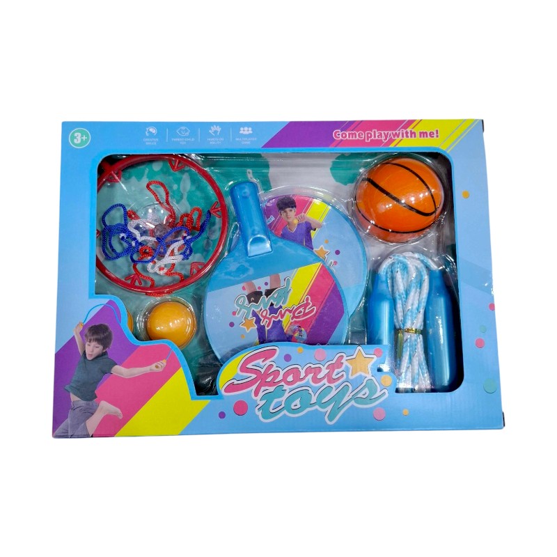 3-in-1 children's sports set with Ping Pong set, skipping rope and mini Basket.