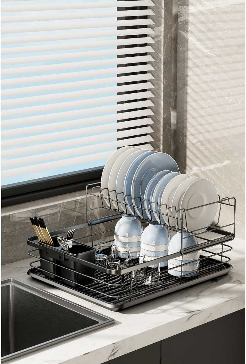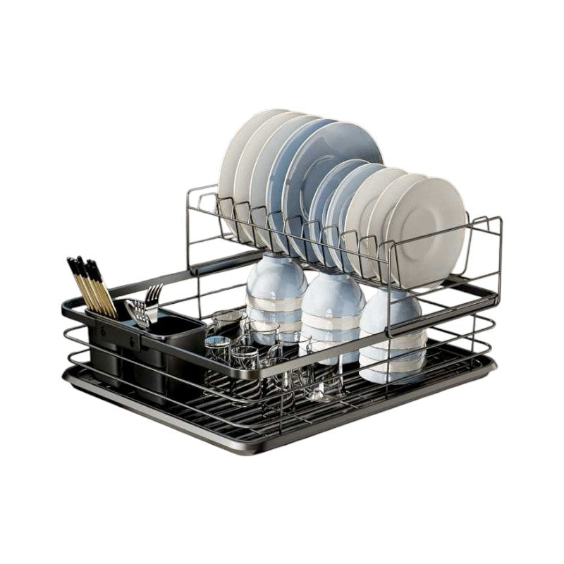 Metal dish drainer, two-tiered with cutlery holders.