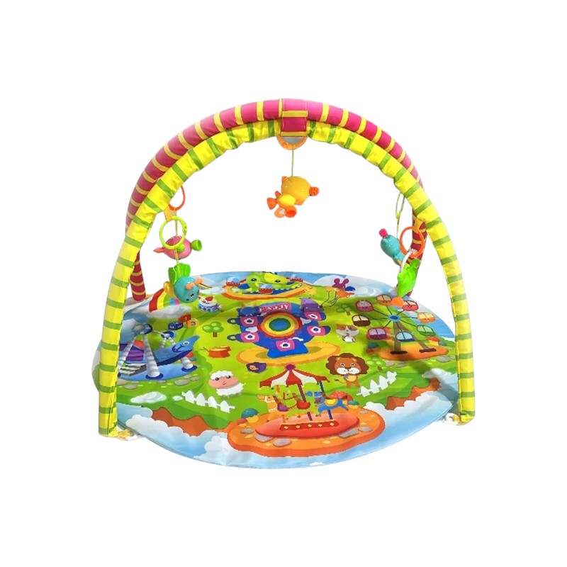 Βρεφικό γυμναστήριο με κρεμαστά παιχνίδια, με μαλακό στρωματάκι με σχέδια από απαλό υποαλλεργικό ύφασμα.
