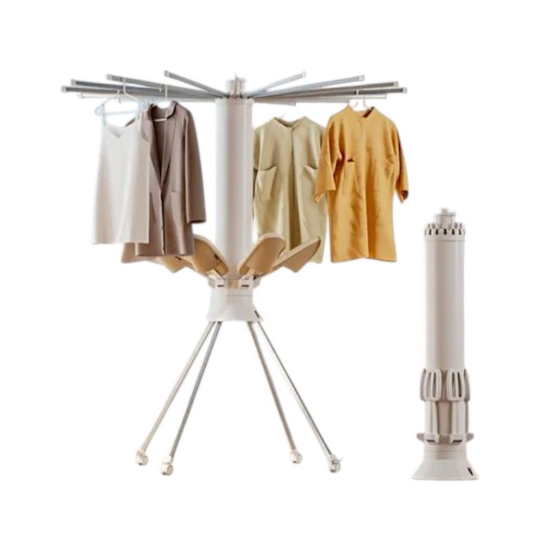 Πτυσσόμενη κρεμάστρα δαπέδου και απλώστρα ρούχων πολλαπλών χρήσεων, με μεταλλικό σκελετό, βάσεις παπουτσιών και ροδάκια μετακίνησης.