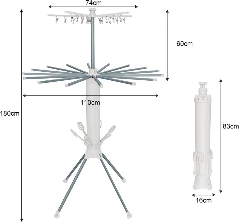 Πτυσσόμενη κρεμάστρα δαπέδου και απλώστρα ρούχων πολλαπλών χρήσεων, με μεταλλικό σκελετό, βάσεις παπουτσιών, κλιπς/μανταλάκια μικρών ρούχων και ροδάκια μετακίνησης.
