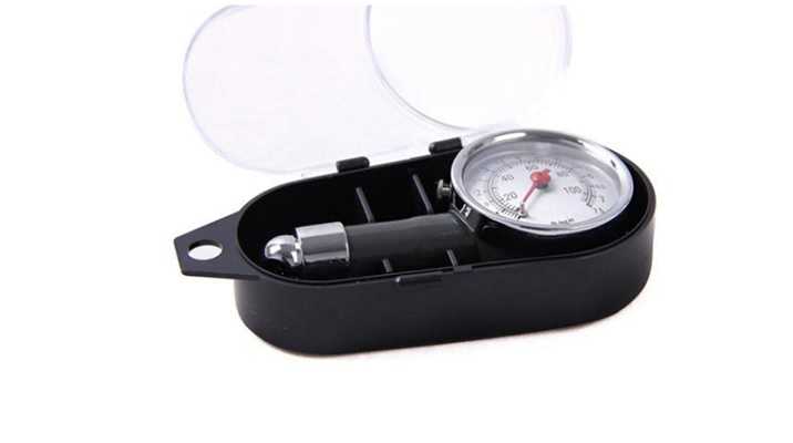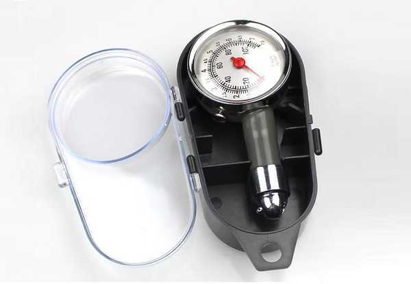 Μετρητής πίεσης ελαστικών με μανόμετρο σε εργονομική θήκη αποθήκευσης.