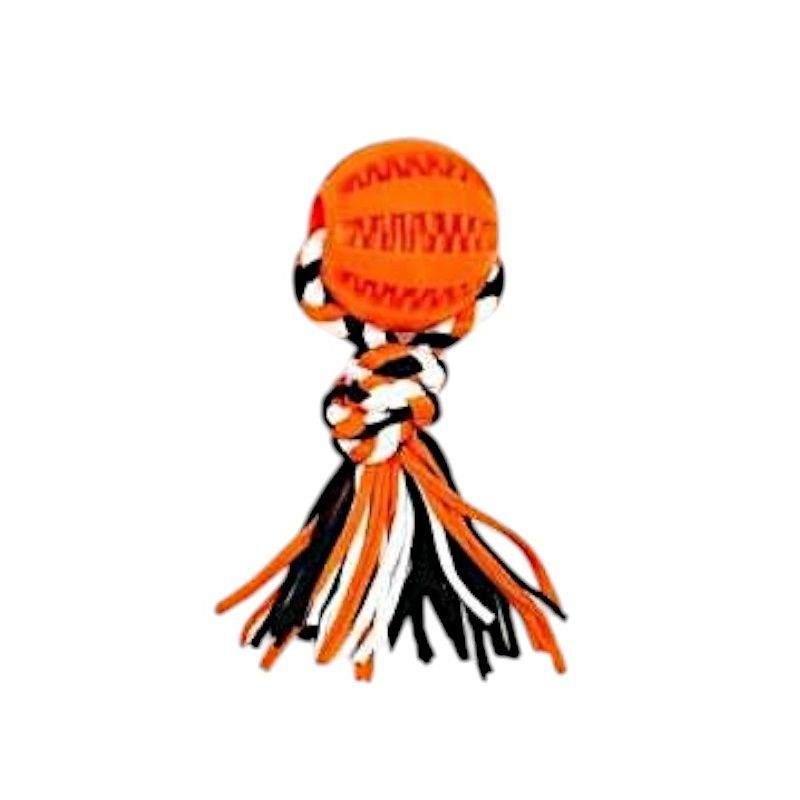 Παιχνίδι σκύλου πλεκτό σχοινί με μπάλα μασητική, κατασκευασμένο από ιδιαίτερα ανθεκτικά, μη τοξικά υλικά, ιδανικό για πολλαπλά είδη παιχνιδιού και άσκησης, ενώ παράλληλα βοηθά στην υγιεινή στόματος του σκύλου σας καθώς καθαρίζει ήπια και απασχολεί τα δόντια του. Συνολικό μήκος: 18cm.