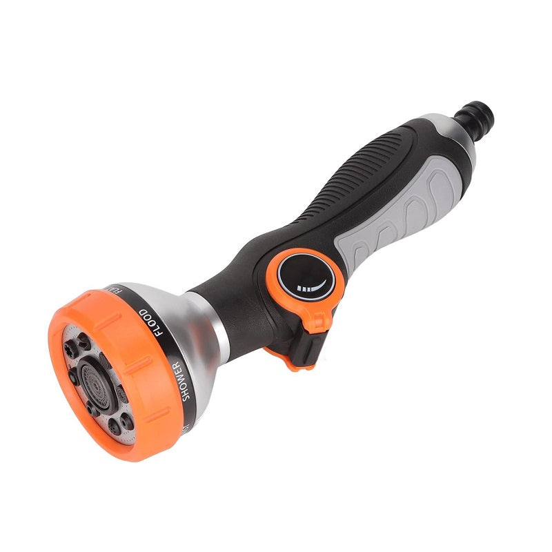 Πιστόλι ποτίσματος για λάστιχο, με 8 διαφορετικές ρυθμίσεις ψεκασμού. Διαθέτει εύχρηση βαλβίδα ώθησης αντίχειρα. Κατασκευασμένο από ενισχυμένο πλαστικό, ανθεκτικό στις υψηλές πιέσεις.