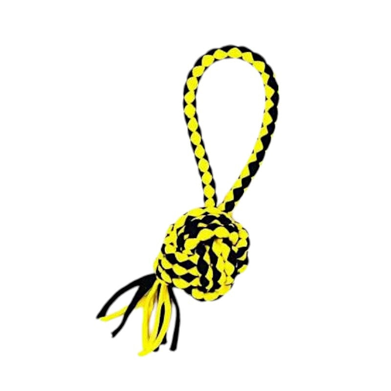 Παιχνίδι σκύλου μπάλα πλεκτή με σχοινί και λαβή, κατασκευασμένη από ιδιαίτερα ανθεκτικό πολυεστέρα, μη τοξικό, ιδανικό για παιχνίδια ανάκτησης και πολλαπλά είδη παιχνιδιού και άσκησης. Θα γίνει το αγαπημένο καθημερινό παιχνίδι που το σκυλί σας θα λατρέψει. Μήκος: 22cm.