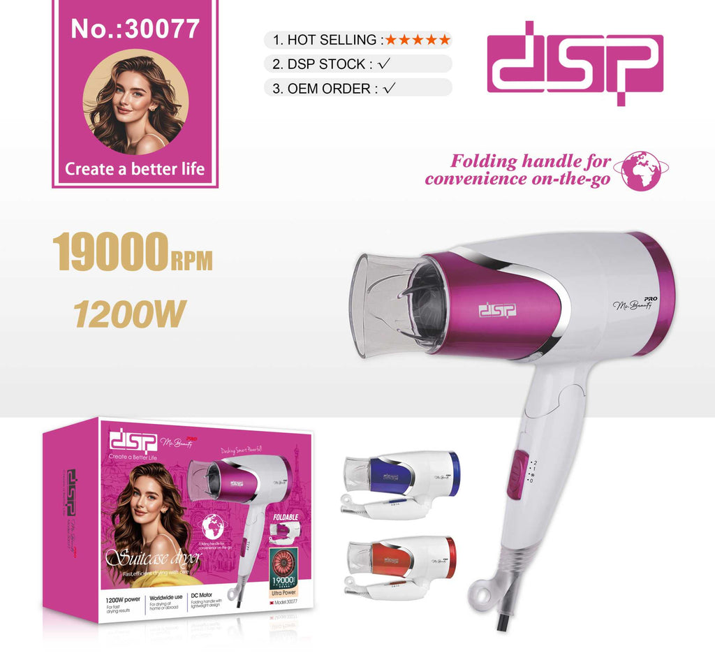 Mini πιστολάκι μαλλιών της DSP με υψηλή απόδοση και δυνατή ροή αέρα για γρήγορο στέγνωμα.