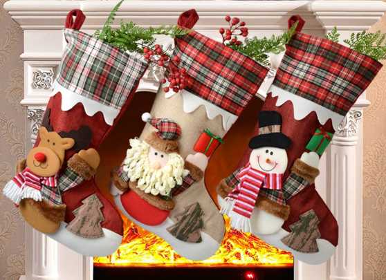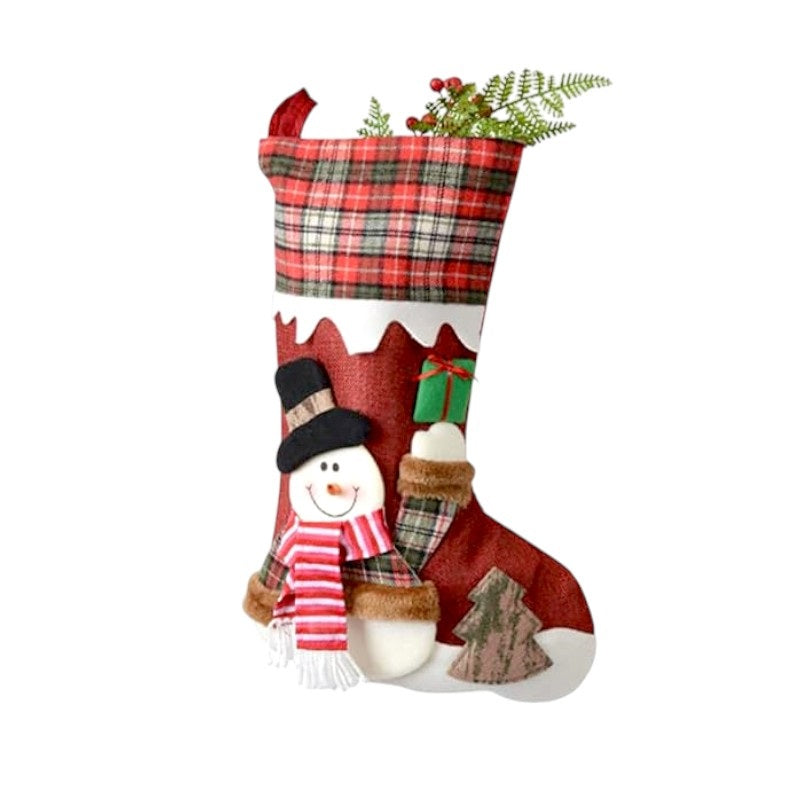 Χριστουγεννιάτικη διακοσμητική κάλτσα κρεμαστή σε υπέροχο σχεδιασμό με λούτρινη φιγούρα και στολίδια.