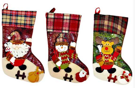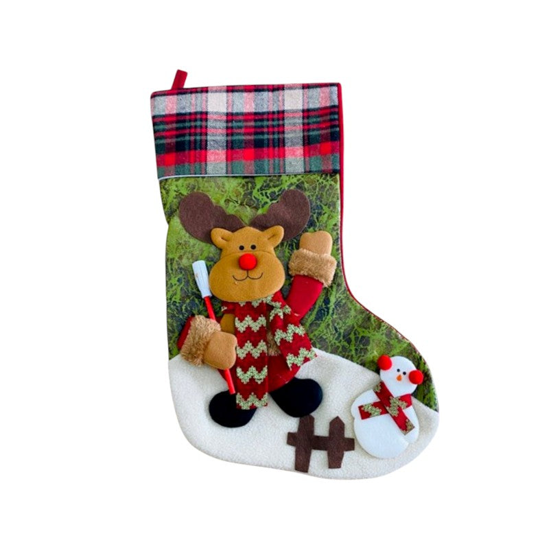 Χριστουγεννιάτικη διακοσμητική κάλτσα κρεμαστή σε υπέροχο σχεδιασμό με λούτρινη φιγούρα και στολίδια.
