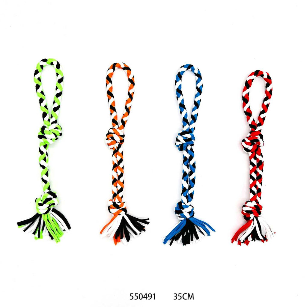 Παιχνίδι σκύλου σχοινί με κόμπους, από ελαστικό, ανθεκτικό, μη τοξικό πολυεστέρα, ιδανικό για παιχνίδια τραβήγματος/αντίστασης ενώ παράλληλα βοηθά στην υγιεινή στόματος του σκύλου σας καθώς καθαρίζει ήπια και απασχολεί τα δόντια του. Συνολικό μήκος: 35cm.