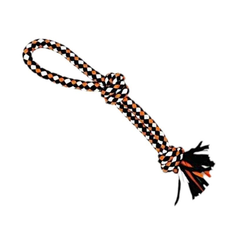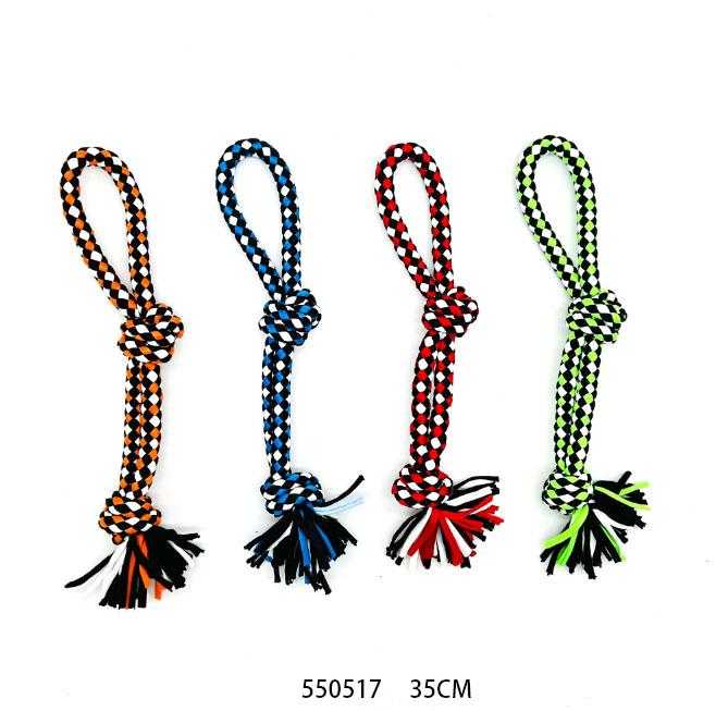 Παιχνίδι σκύλου σχοινί με κόμπους, από ελαστικό, ανθεκτικό, μη τοξικό πολυεστέρα, ιδανικό για παιχνίδια τραβήγματος/αντίστασης ενώ παράλληλα βοηθά στην υγιεινή στόματος του σκύλου σας καθώς καθαρίζει ήπια και απασχολεί τα δόντια του. Συνολικό μήκος: 35cm.