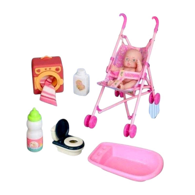 Σετ κούκλα με καροτσάκι βόλτας και πλήρες σετ μπάνιου με μπανιέρα και πλυντήριο, σε πανέμορφο πολύχρωμο σχεδιασμό με πολλαπλές δυνατότητες και με ανθεκτική κατασκευή για ατελείωτο παιχνίδι!