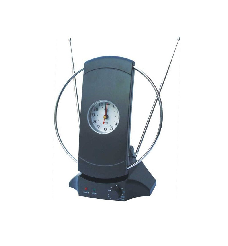 Περιστρεφόμενη κεραία τηλεόρασης εσωτερικού χώρου με ενίσχυση σήματος. Ιδανική λύση για όσους αντιμετωπίζουν πρόβλημα με την ποιότητα της εικόνας και του σήματος της τηλεόρασής τους, αλλά αδυνατούν να τοποθετήσουν σταθερή εξωτερική κεραία. Διαθέτει ενσωματωμένο αναλογικό ρολόι και μοντέρνο σχεδιασμό.