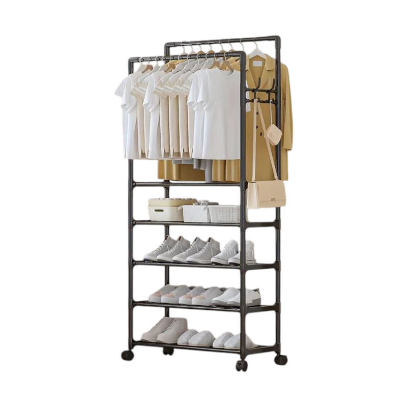 Τροχήλατη κρεμάστρα δαπέδου μεταλλική, με 5 ράφια και πλαϊνές κρεμάστρες, ιδανική ως έπιπλο εισόδου ή για την οργάνωση των ρούχων στο δωμάτιό σας.