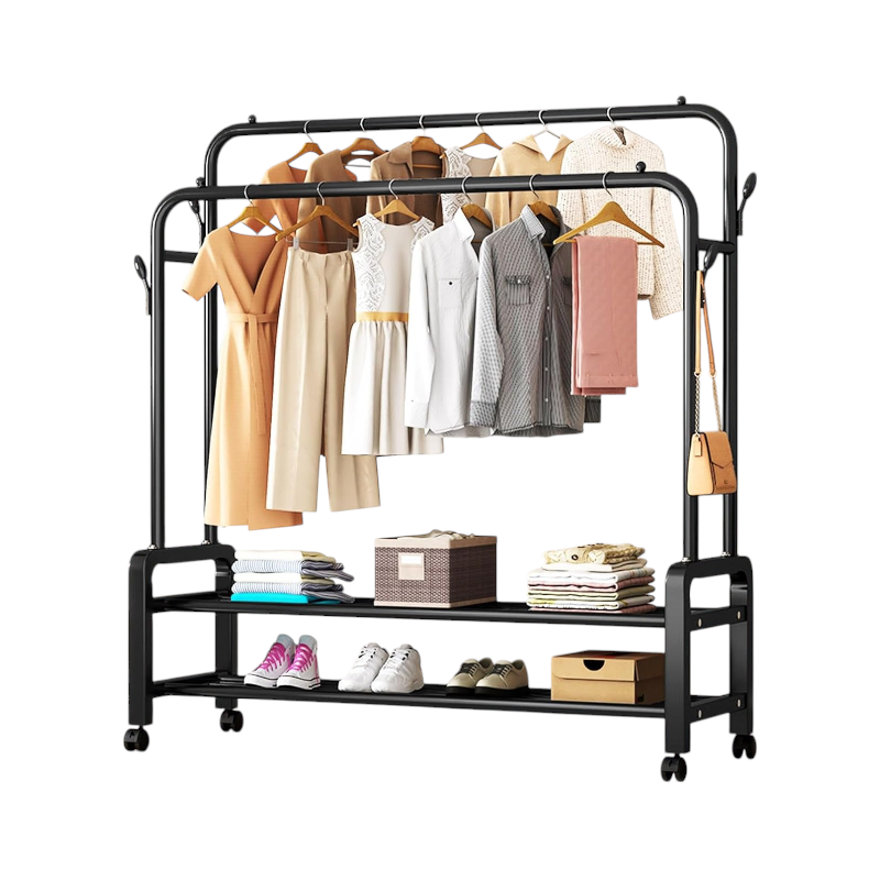Τροχήλατη κρεμάστρα δαπέδου μεταλλική, με 2 ράφια παπουτσιών και πλαϊνές κρεμάστρες, ιδανική ως έπιπλο εισόδου ή για την οργάνωση των ρούχων στο δωμάτιό σας.